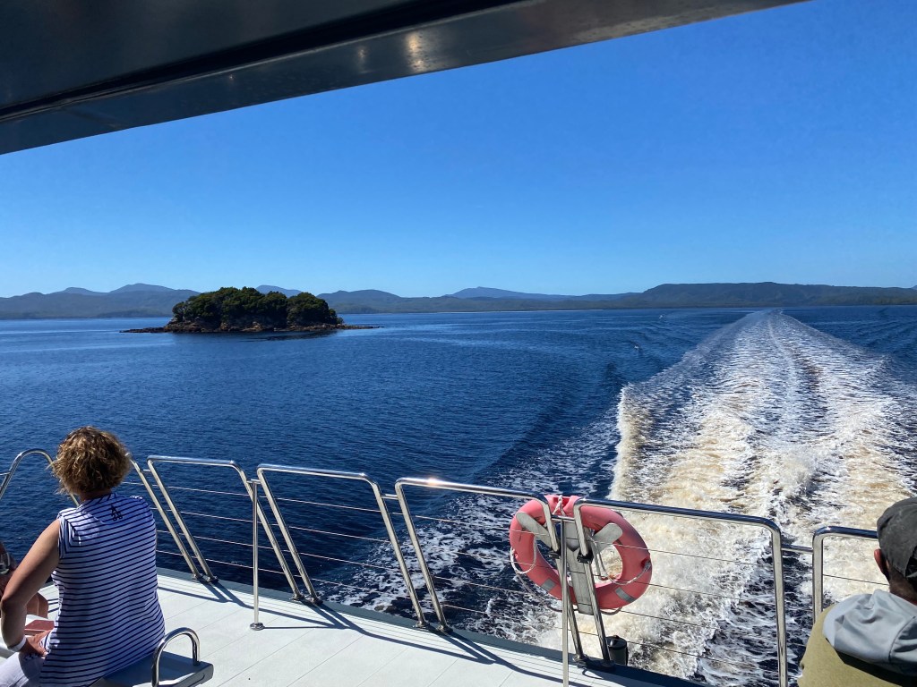 Despite the caravan park Tuesday was a ripper day. Earlyish start saw us head down to where the Gordon River Cruises depart from – a clear blue sky, shone down on dead calm waters as we waited to board. The cruise lasted for near on seven hours. They first took us to Hells Gate – the only opening into Macquarie Harbour (the harbour Strahan is situated on). Leaving the sheltered waters of the harbour brought us directly into The Roaring Forties with swells up to 5m on the day of our cruise (wave measuring equipment once measured waves of at least 20m before the equipment broke). We then visited some fish farms. Local companies farm sea trout and salmon for national and international consumption. We ended up at the Gordon River – a world heritage site. The cruise along the river was so tranquil and peaceful – we took in the unspoilt environment. A quick 40 minute visit to a stunning temperate rainforest saw us ready for a delicious buffet lunch. As we ate we cruised back to the harbour and then with the boat’s throttle opened back up headed to Sarah Island – once home to one of Australia’s most notorious convict settlements. An entertaining tour that lasted a good hour saw us head back onboard for a quick sprint across the harbour and an end to the cruise. All in all a brilliant morning – would highly recommend this cruise.