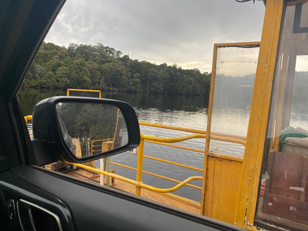 Wednesday saw us pack up and leave Strahan. No tears shed on driving out of the caravan park that’s for sure! We decided we would not travel back along any roads we had used before, so mapped out a route that used some lesser roads and even some unsealed roads. This took us up through Zeehan and then though some very interesting scenery up to Corrina. We travelled through many kilometres of melaleuca scrubland – punctuated by numerous clearings where masses of bee hives were located, clearly there to produce the delicious honey these plants help make. On reaching Corrina we had to take a small one car ferry across the beautiful Pieman River.